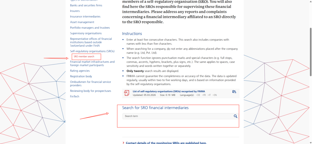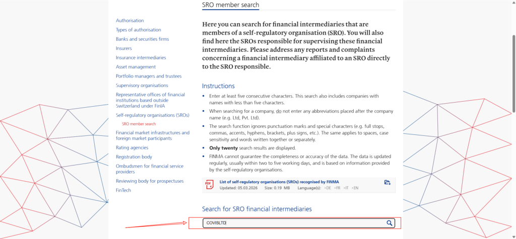 投资者及金融机构可通过 瑞士金融市场监督管理局(Swiss Financial Market Supervisory Authority,FINMA) 官方数据库查询企业的监管信息,以验证相关金融机构是否获得 FINMA 授权或监管。