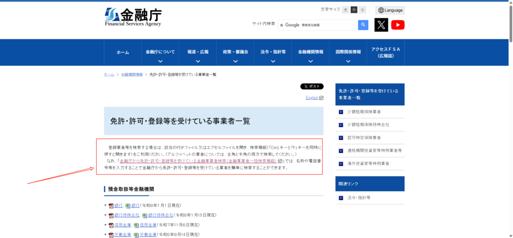 在日本金融厅官网中找到 Registered Financial Institutions(注册金融机构) 查询栏目。