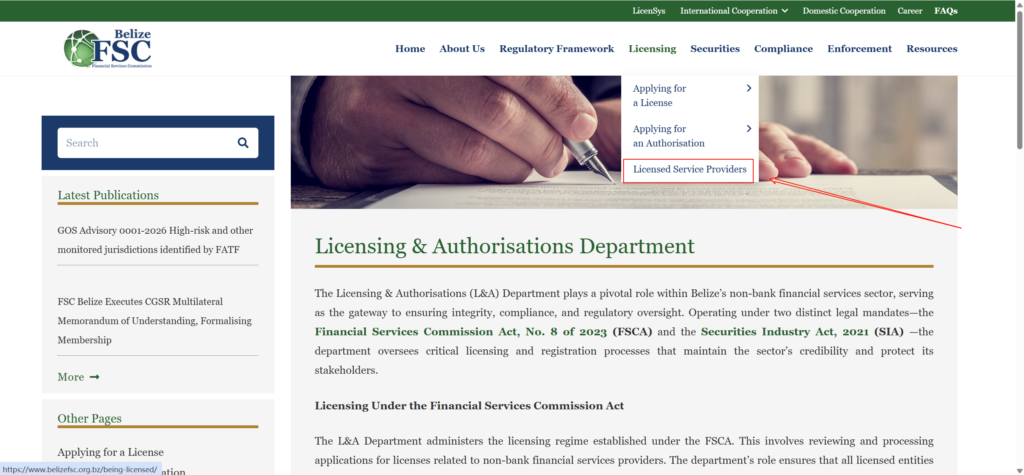 投资者及金融机构可通过 伯利兹国际金融服务委员会(International Financial Services Commission,IFSC) 官方数据库查询企业的金融服务牌照信息,以验证相关金融机构是否获得伯利兹监管机构授权。