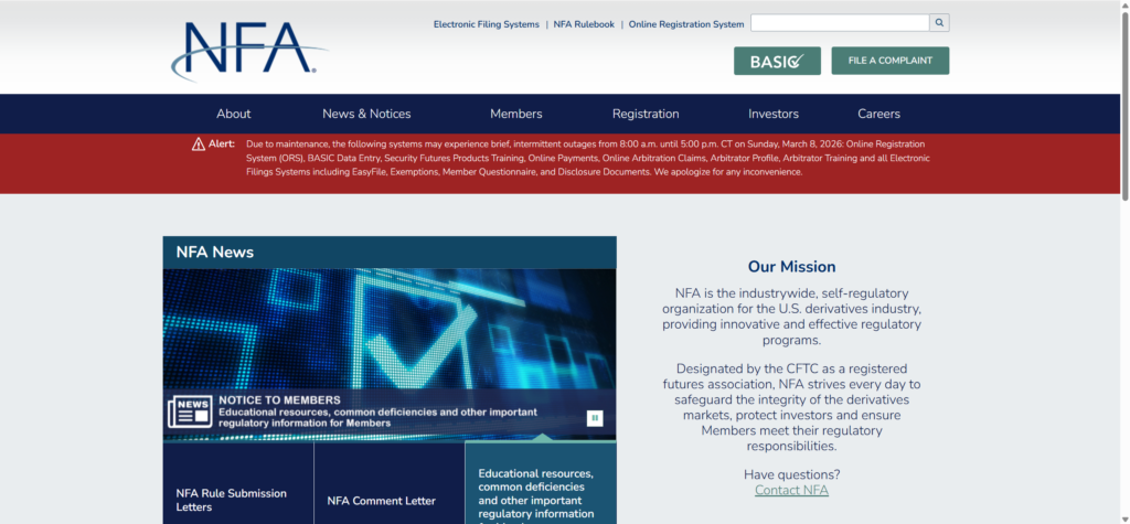 NFA 是美国期货及外汇市场的重要自律监管机构,负责监管 期货经纪商、外汇交易商、商品交易顾问及金融衍生品机构。通过 NFA 官方系统,用户可以核实企业的注册状态、监管编号及业务许可范围。