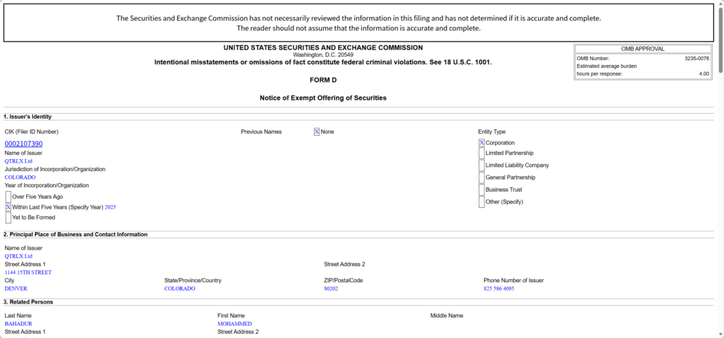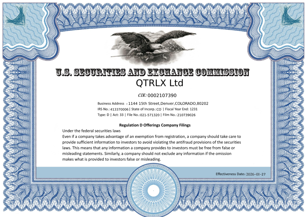 QTRLX Ltd 已在美国证券交易委员会(SEC)EDGAR系统完成备案,其Form D文件已公开披露。