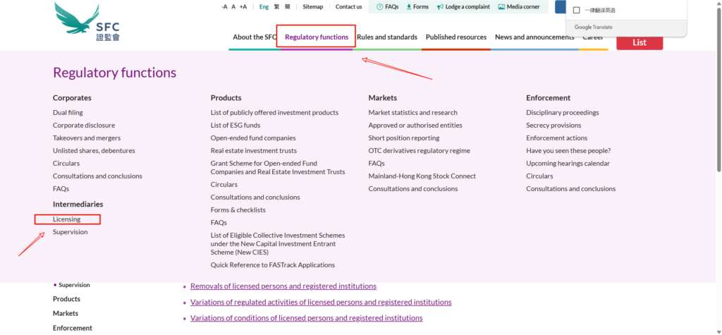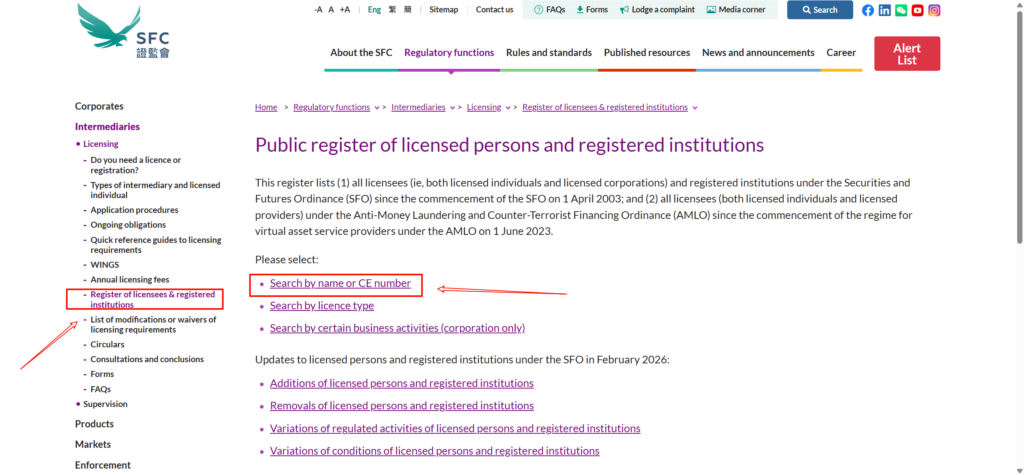 在 SFC 官网导航中找到 Public Register of Licensed Persons and Registered Institutions(持牌人及注册机构公众登记册)。
