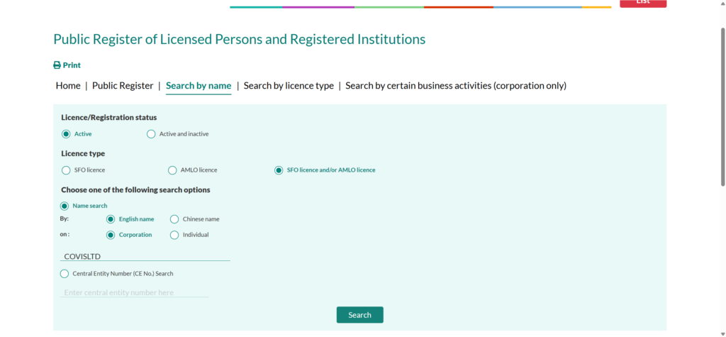 点击 Search 按钮后,系统将显示符合条件的 SFC 持牌机构列表。