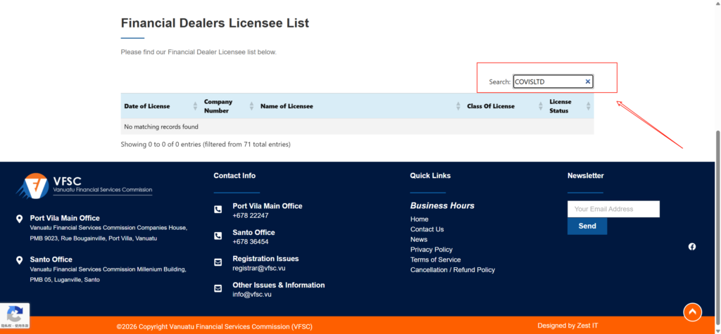 如果查询不到结果,则说明该公司 未获得 VFSC Financial Dealer License